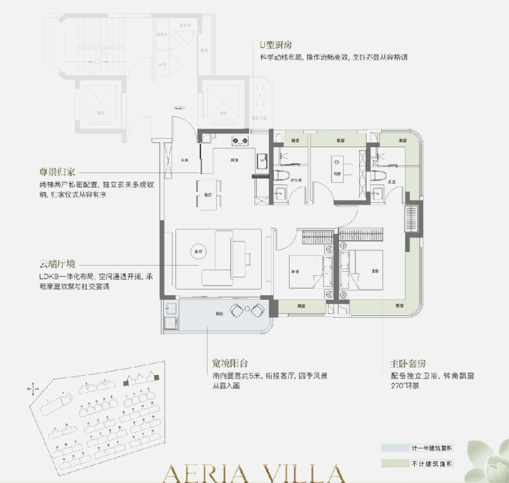 地上两层从容布局,满足多代同堂的居住需求。特别是二层南向的超尺度主卧套间,配备270°环幕视野、独立卫浴及衣帽间,其奢华体验堪比顶级酒店套房。主卫亦享有270度转角飘窗,让日常洗漱成为一种景观享受。