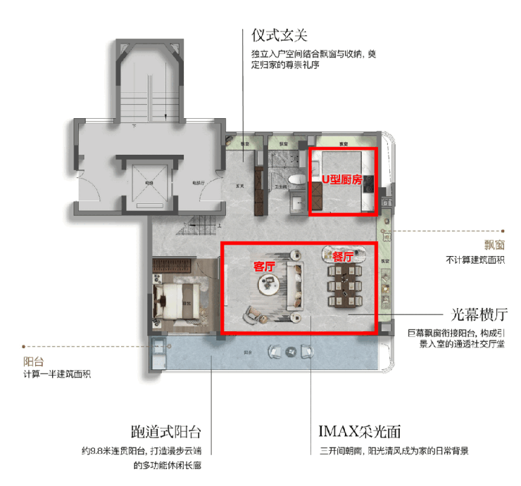 在细节打磨上,此户型亦不遗余力。全屋飘窗全赠送约9.8㎡,配合约7.2㎡的大阳台(计一半建筑面积)不仅增加了实际使用面积,更在视觉上提升了空间的通透感。
