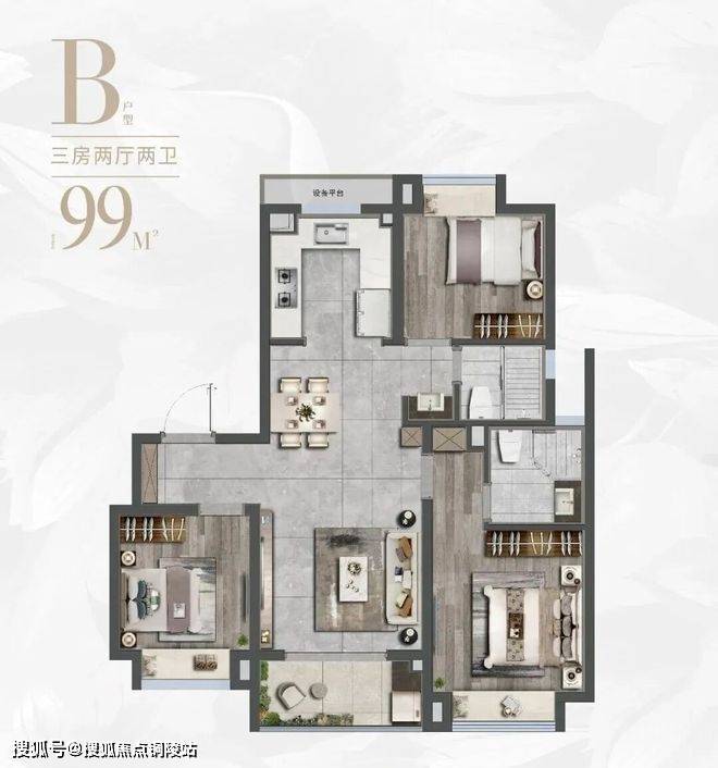 建面约99平方米三房两厅两卫:经典“飞机户型”布局,三开间朝南、南北通透,实现采光与通风的优化。客餐厅一体化与开放式厨房组合,搭配观景阳台,形成超大公区。主卧套房设计,私密性与舒适度兼备,满足三口之家的进阶需求。这也是项目当前主力在售户型。