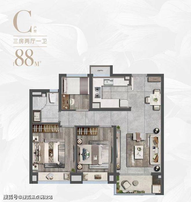 建面约88平方米三房两厅一卫:三开间朝南设计,格局方正通透,空间利用率高。总价约365万元起,是年轻家庭首次置业的理想选择。
