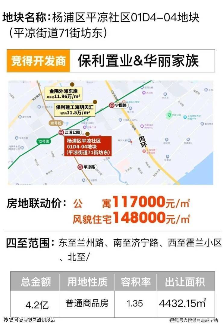 ✅蘭桂坊售楼处电话:400-8787-740✅︎✅︎✅2023年12月,第四轮土拍中,华丽家族&保利以总价41885万元,拿下了杨浦区平凉社区01D4-04地块(平凉街道71街坊东),容积率1.35,溢价率0%,楼板价70002元/㎡,装修标准不低于40000元/㎡,房地联动价公寓117000元/㎡,风貌住宅148000元/㎡。