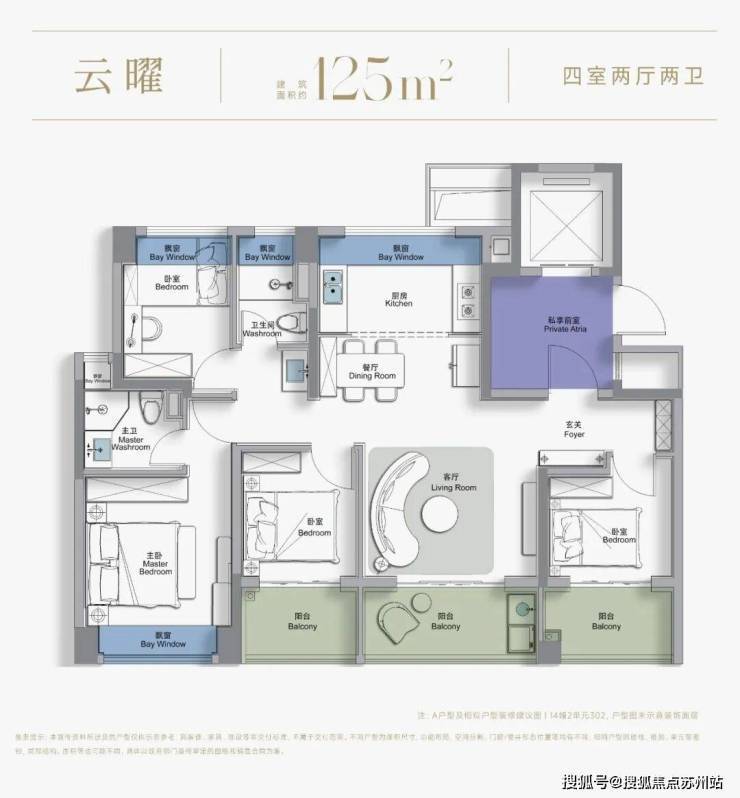建面约125㎡为上海新房市场上罕见的“四开间朝南”户型,三个卧室朝南,再加上多阳台与飘窗,整个户型的采光面和实得率都做到了同面积段中的极致。