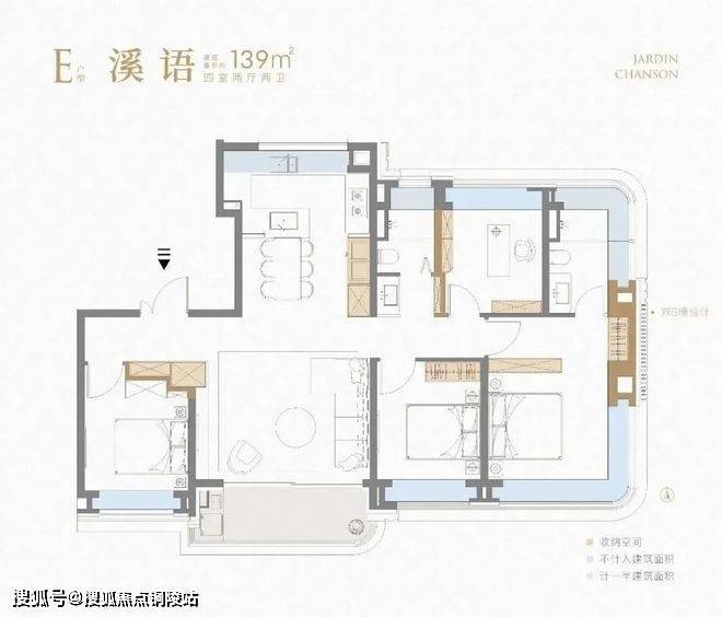 第三处山墙s墙的技术含量更高,直接让户型拥有两个大转角飘窗(主卧+主卫均双270°弧形转角飘窗)。凹处填放一个衣柜,视觉效果舒适,业主第一眼无知无觉,殊不知背后大有玄妙。