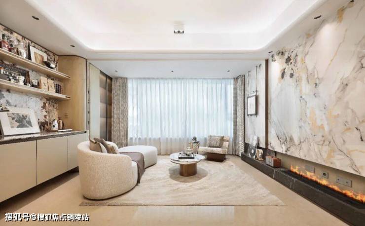 其二,含“奢石量”超高,审美质感在线。客厅地板选用土耳其进口石材,主卫台面为云顶白石材,玄关台面采用雪山银狐奢石。