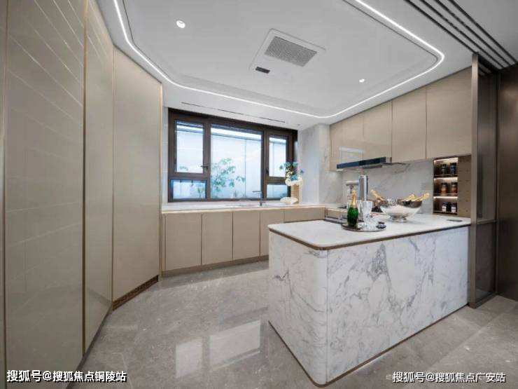 甚至,厨房的面宽也达到了约4.55米,超过主卧的面宽。独特的G型设计,串联起中西厨,岛台还贴心的做了加高处理。