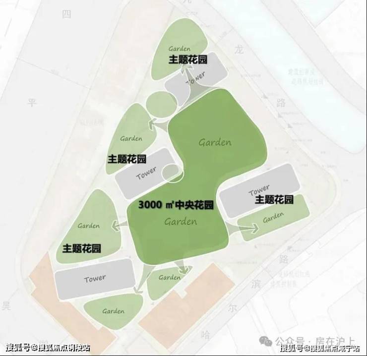 社区景观上,突破市区项目常见的「兵列树阵式」布局,通过建筑楼体的精密偏转,形成罕见的围合式社区形态。