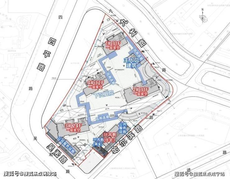 4栋住宅一层全部为架空,入口至楼栋间设置有风雨连廊。