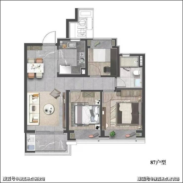 建面约87㎡3房,做到了三开间朝南设计,整个户型几乎没有浪费面积。实现空间节约、居住升级等美好体验。