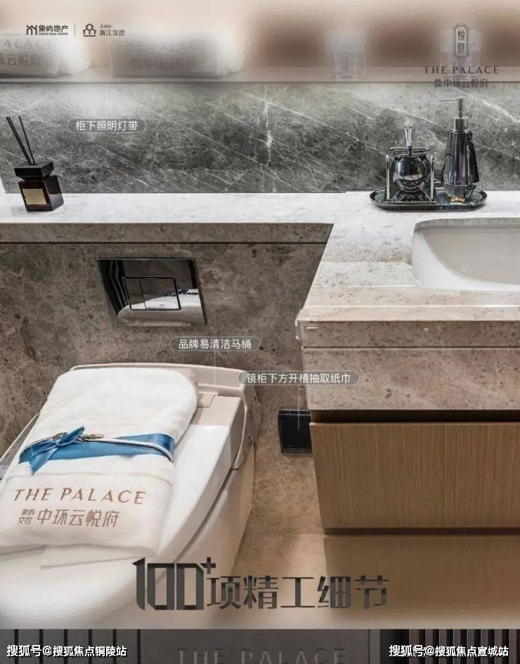 卫浴空间同样精彩,采用高仪的台盆、龙头、智能马桶、淋浴花洒等,主卫创新定制“美妆冰箱”,满足业主对美妆、护肤用品冷藏的需求,足见开发商对成本的舍得。
