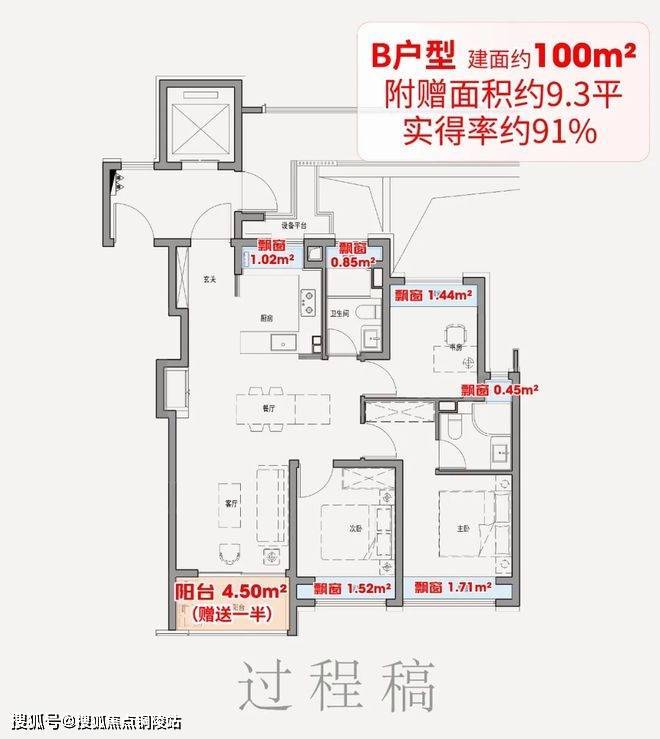项目全系户型标配“全屋飘窗(全赠送)+大阳台(半赠送)”,经专业测算,百平米中间套实得率约91%,边套更甚,远超市场常规水平: