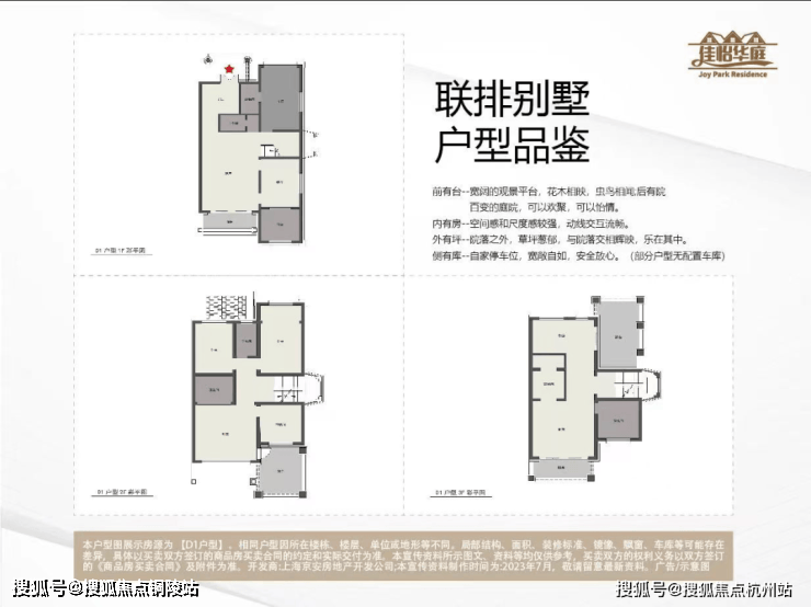双拼:277-302㎡,4 房 2 厅 4 卫,地上 3 层 + 地下 1 层,南向 10.8 米面宽、全明通透、全景落地窗,附赠 80-120㎡私家庭院 + 双车位