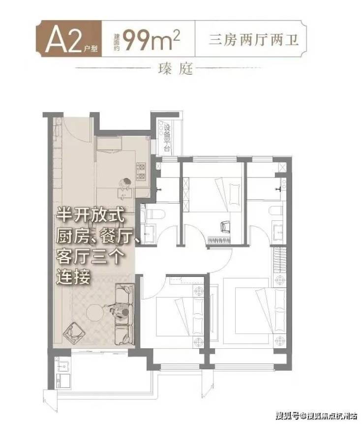 建面99㎡3房2厅2卫户型图▼