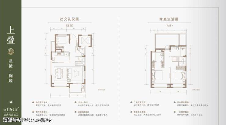 户型解析:建面约126㎡上叠产品,带有空中花园露台,日常聚餐、烧烤、开party等娱乐活动有大展拳脚的空间,同时客餐厅一体化+U型厨房空间+尊崇主卧套房,户型设计合理,格局方正。