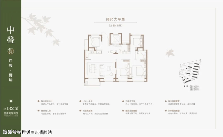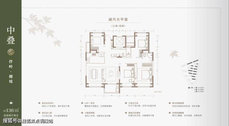 户型解析:建面约137㎡下叠,四房两厅三卫全能格局,非常适合二娃家庭以及三代同堂。