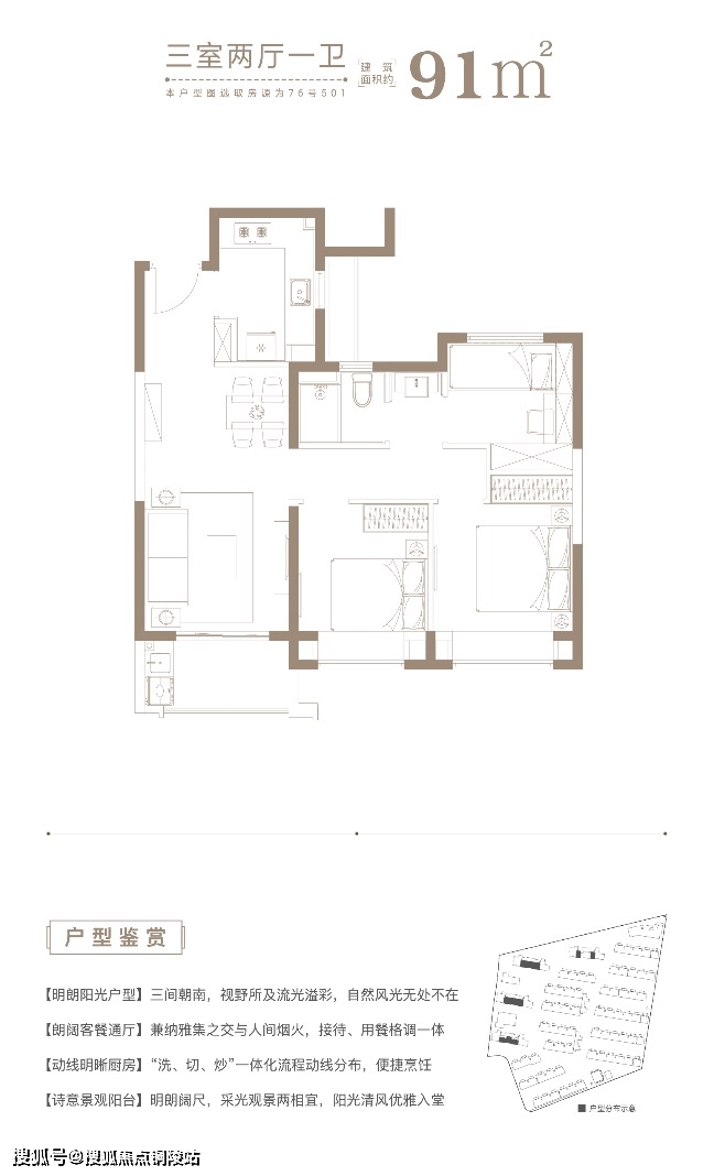 户型解析:三开间朝南+双朝南卧室带飘窗+动静分离+卫生间干湿分离,采光面拉到极致!是一个非常方正的户型。