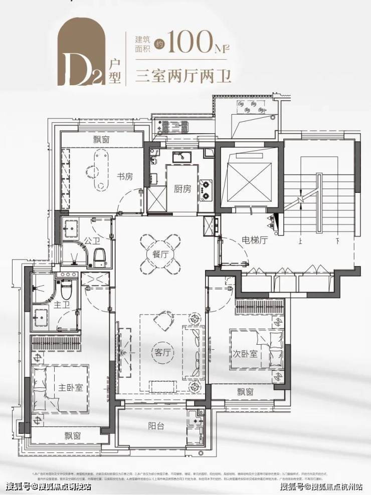 另一套 建面约100㎡飞机户型,同样做了三房两卫 ,户型方正,几乎无过道设计,每一寸空间都没有浪费,舒适不局促。