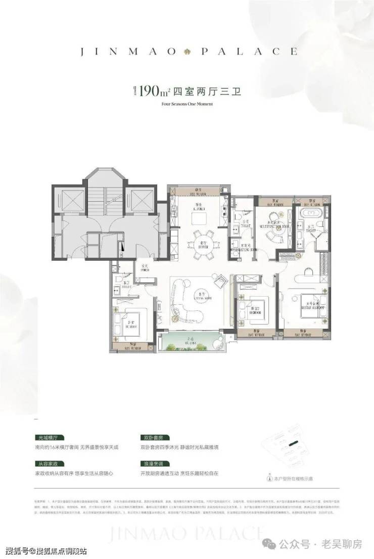 ● 建面约190㎡4房:楼王位置的顶奢大平层,同价位段在杨浦只能买到约120㎡3房!