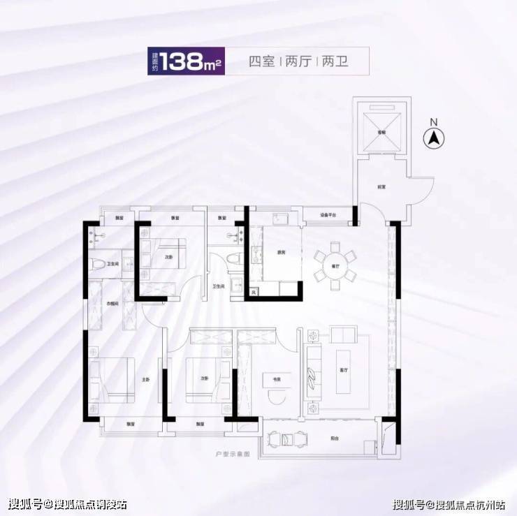 四开间朝南的建面约138㎡4房2卫,可满足大家庭一步到位需求。