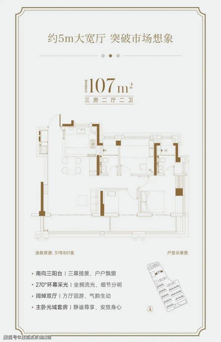 约107m²户型,赠送面积约15m²,实得率约96%,于紧凑面积中,实现罕见奢阔。完全可以满足三口之家或三代同堂年轻家庭居住!约5.0米南向大宽厅,连接约16㎡景观阳台,构成开阔的LDK一体化空间。