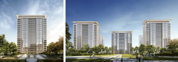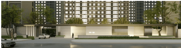 外立面采用经典时尚现代主义风格:通过温和的色彩搭配、简练的横向线条、黄金比例的立面比例、极简抽象的建筑符号、建筑顶部的飘板,呈现一个现代风格和艺术气质结合的高品质社区。
