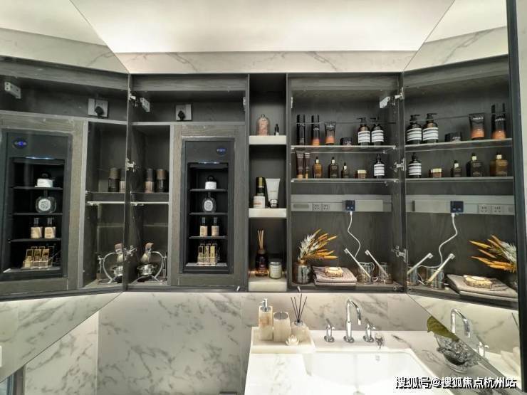 双卫配置,其中一个做了干湿分离,科勒台盆+双智能马桶+高仪花洒,除雾镜柜均内置了牙刷消毒器、预留吹风机插座。主卫镜柜还有美妆冰箱,收纳空间相当充足。