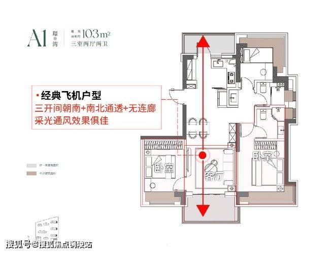 建面103㎡3房2厅2卫,户型三开间朝南、室内“5个飘窗+2阳台”,不管是采光、视野、通风、私密性,还是实用性都十分出色。