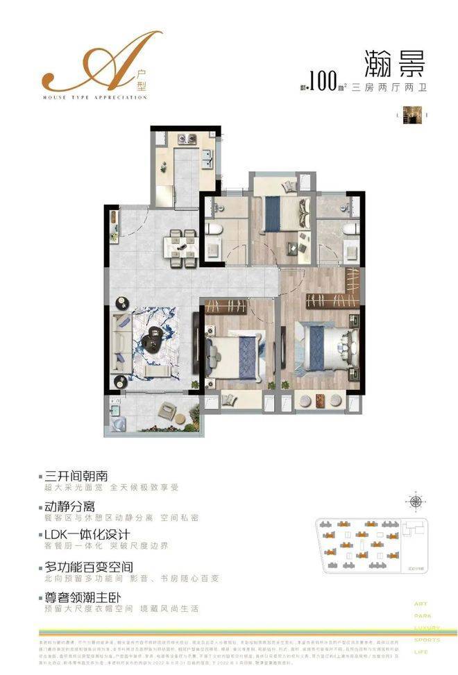 上实·望海项目在售建面约100㎡、120㎡、122㎡的高层3房户型,能够满足不同家庭结构和生活阶段的居住需求。其中,100㎡户型为3房2卫,三开间朝南、全卧室带飘窗、客厅带宽面阳台的设计,能让室内充满阳光,满足从二人世界到二胎生活的全生命周期需求。