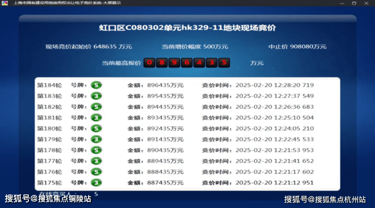 2025年2月,今年第一批次土拍中,经过184轮竞价,金茂&庆隆联合体以总价896435万元竞得虹口C080302单元hk329-11地块,溢价率38.2%,折合楼板价117474元/㎡,装修标准不小于4000元/㎡。