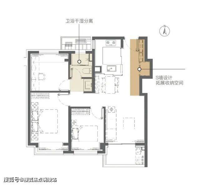更值得一提的是建筑面积约89平方米户型“S墙创新设计”,为相邻两户创造出了额外的凹槽空间,扩展了收纳。将冰箱塞入这个凹槽,释放厨房的冰箱空间,延伸灶台面积,或者可以做岛台……让小户型不在受收纳空间的支配;
