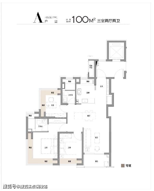 100㎡户型,双270°飘窗设计(南向主卧+北向书房),南次卧、厨房、双卫飘窗,厨房烟道外移,飘窗配置抽屉,极致空间利用率。