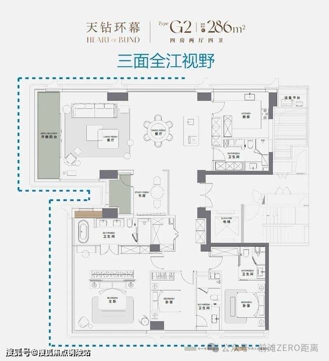 而286㎡户型则是顶豪黄金面积段,拥有三面看江的顶级视野,约16平方米的开敞阳台是新规下的顶配尺度,可称之为“孤品级产品”,总价控制在4500-5500万之间。