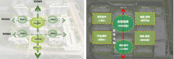 围绕“一轴·一心·四园”的景观设计理念 ,以中央花园和健康静谧的组团花园,通过现代主义建筑风格演绎,呈现充满运动活力和健康生活的公园式品质社区。