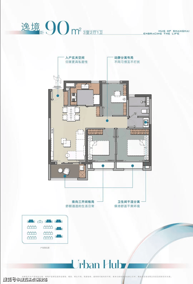 90㎡三房两厅一卫,三开间朝南户型,动静分离。样板间实景图如下: