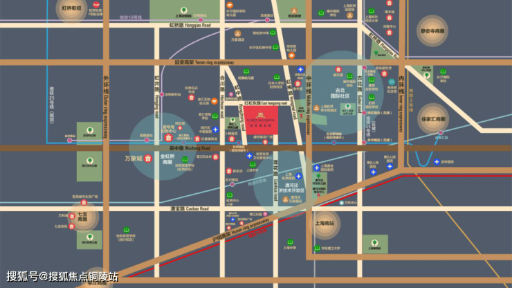 交通配套方面:项目地处长宁、徐汇、闵行三区交汇的金虹桥板块的核心区位,拥有多维立体的交通,延安高架、中环线、外环线环伺。
