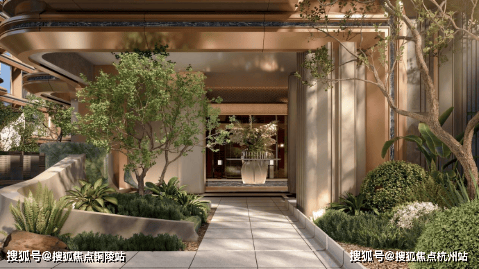 项目还规划了下沉式庭院,搭配叠水、绿植,形成立体景观。在滨江这种地段,愿意把土地拿出来做景观,本身就是一个态度。