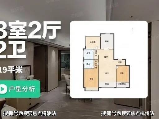建面约 119㎡ 三房两厅两卫:爆款主力户型,格局方正,南北通透;客餐厅一体化设计,面宽约 3.6 米,连通南向阳台,社交空间开阔;主卧套房设计,带独立卫浴与转角飘窗,270° 观景视野;双卫配置,客卫干湿分离,满足多人口家庭使用需求。