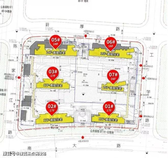 92-01地块拟建6栋15-17F高层住宅产品,并且全部做了首层架空。值得一提的是,项目小区出入口做了景观架构,在3号楼与5号楼之间做了下沉庭院,并在小区中央配置了1623.59㎡的集中绿地。