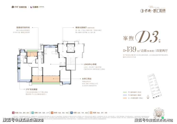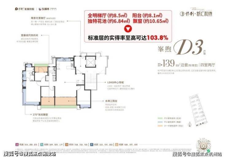 至高约103.8%实得率:项目建面约139㎡户型通过全明梯厅(约8.5㎡)、阳台(约8.1㎡)、独特花池(约6.84㎡)、飘窗(约10.65㎡)等赠送面积,标准层的实得率至高可达103.8%,相当于直接赠送了超200万的空间价值!
