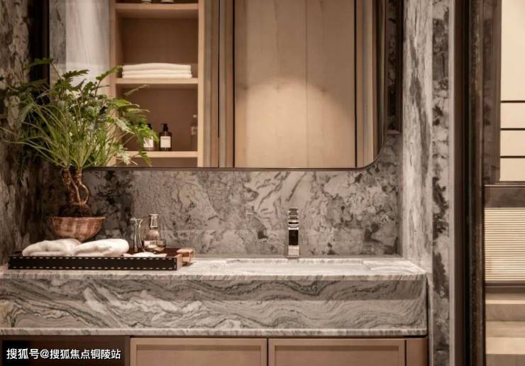 更耐用的细节:比如在主卧背景墙上使用了胡桃木和带有贝母光泽的装饰,在淋浴房用了水云纱石材,这些细节都在默默提升着日常生活的质感。