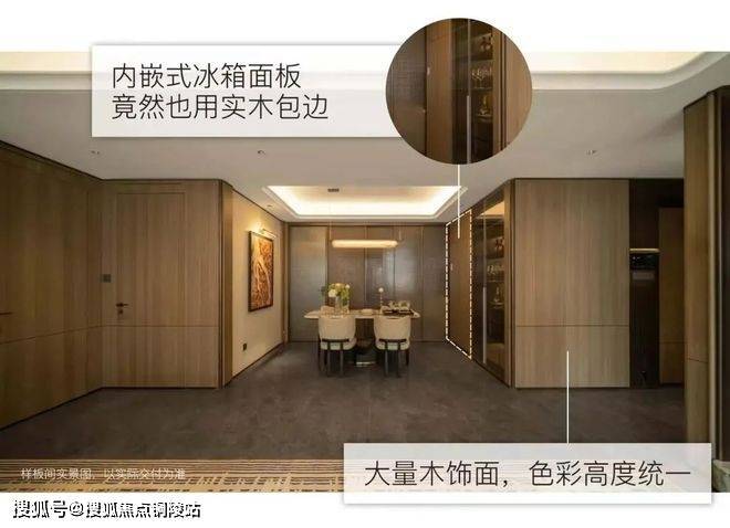 项目墙面铺设大量木饰面,相比墙布,更具质感更温馨。同时为了保持室内色调的统一,建面126㎡内嵌式冰箱的面板也采用木饰面。