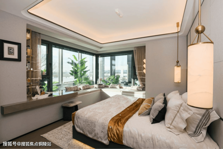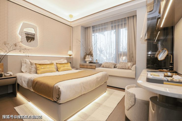主卧套房设计,约270°转角瞰景飘窗,生活的尊贵感拉满。