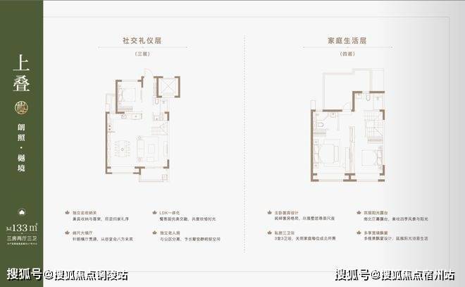 叠墅产品分为4F、6F层叠加, 主力产品建面约约122-133㎡上叠,132㎡大平层,131-145㎡下叠。