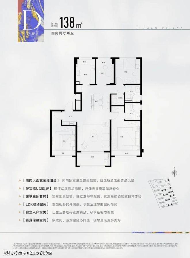 此户型为飞机户型,可以说是改善人群非常喜欢的户型,建面约138㎡4房2厅2卫设计,动静分区,三开间朝南,各空间尺度奢阔,还有一个大面宽景观阳台,实现功能性和舒适度兼得。