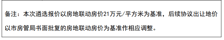 同时本次遴选报价以房地联动房价21万元/平方米为基准,后续协议出让地价以市房管局书面批复的房地联动房价为基准作相应调整。