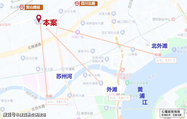 仅从图上看,该地块直线距苏州河约1公里,直线距外滩约1.4公里,直线距北外滩约1.7公里,直线距3/4号线宝山路站约300米,直线距10号线四川北路站约560米,区位优势明显。