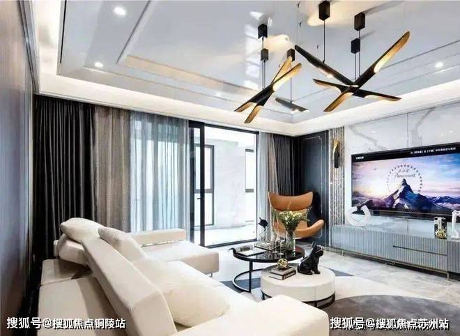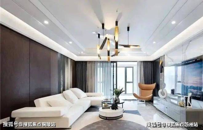 客厅设计简洁明亮,通透大气。无主灯的吊顶,结合白色的家具,上下呼应,和谐统一。深色的背景墙,给空间注入了一股摩登的氛围,造型独特的吊灯,彰显个性的空间氛围。