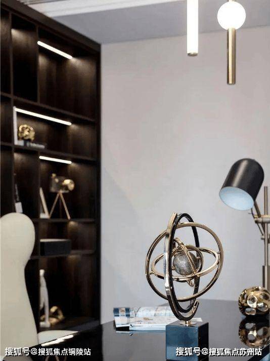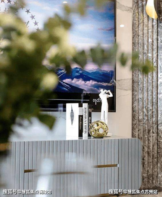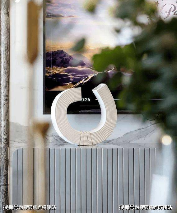 茶几上摆放着黄色金属的工艺品,通过材质的造型和线条,让空间显得更有设计感,同时也凸显出空间主人的精致和时尚。