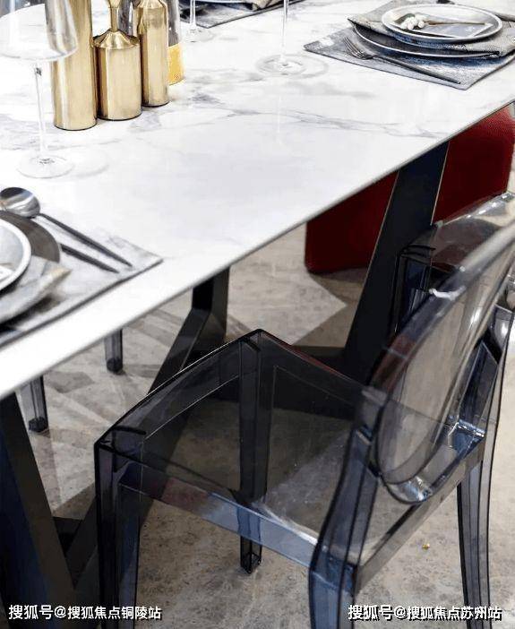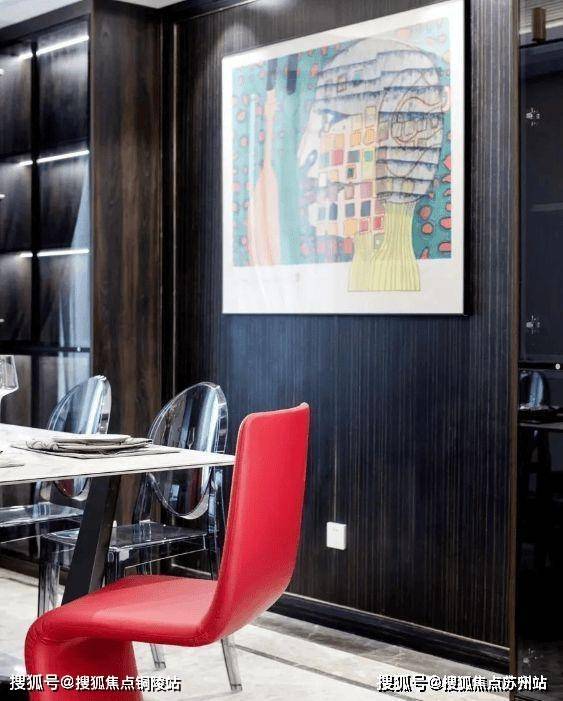 黑白对比的餐桌,几何的线条让氛围显得更加沉稳。为了更加贴合主人的生活习惯,除了红色座椅之外,还搭配了灰色透明的座椅,表现出空间主人对时尚的追求。