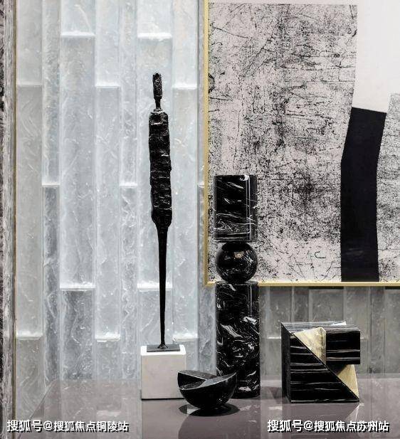 大理石的背景墙和金属线条元素相互搭配,营造空间的大气轻奢之感。灰色的色调,表现出复古优雅的空间氛围。