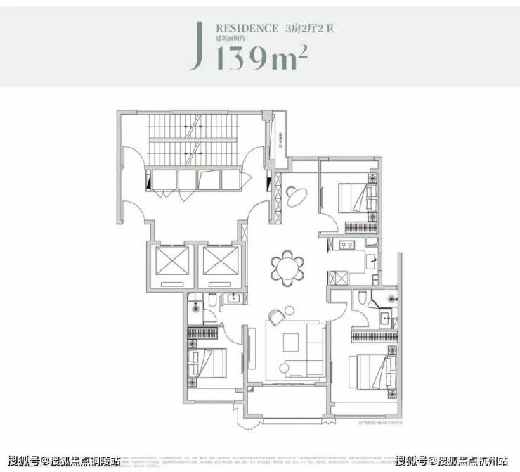 经典的四叶草布局,四开间分布在四角,兼顾私密与互动,是二胎家庭的优选。